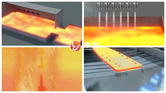 Float glass is made by heating raw materials—silica sand, limestone, soda ash, and magnesium in a furnace. When melted, it’s then spread out over a sizable bed of molten tin. As it moves along rollers in the annealing oven during a controlled cooling process, this mixture slowly solidifies over the molten tin. From this point, a single, continuous smooth ribbon of glass emerges as below picture showed: